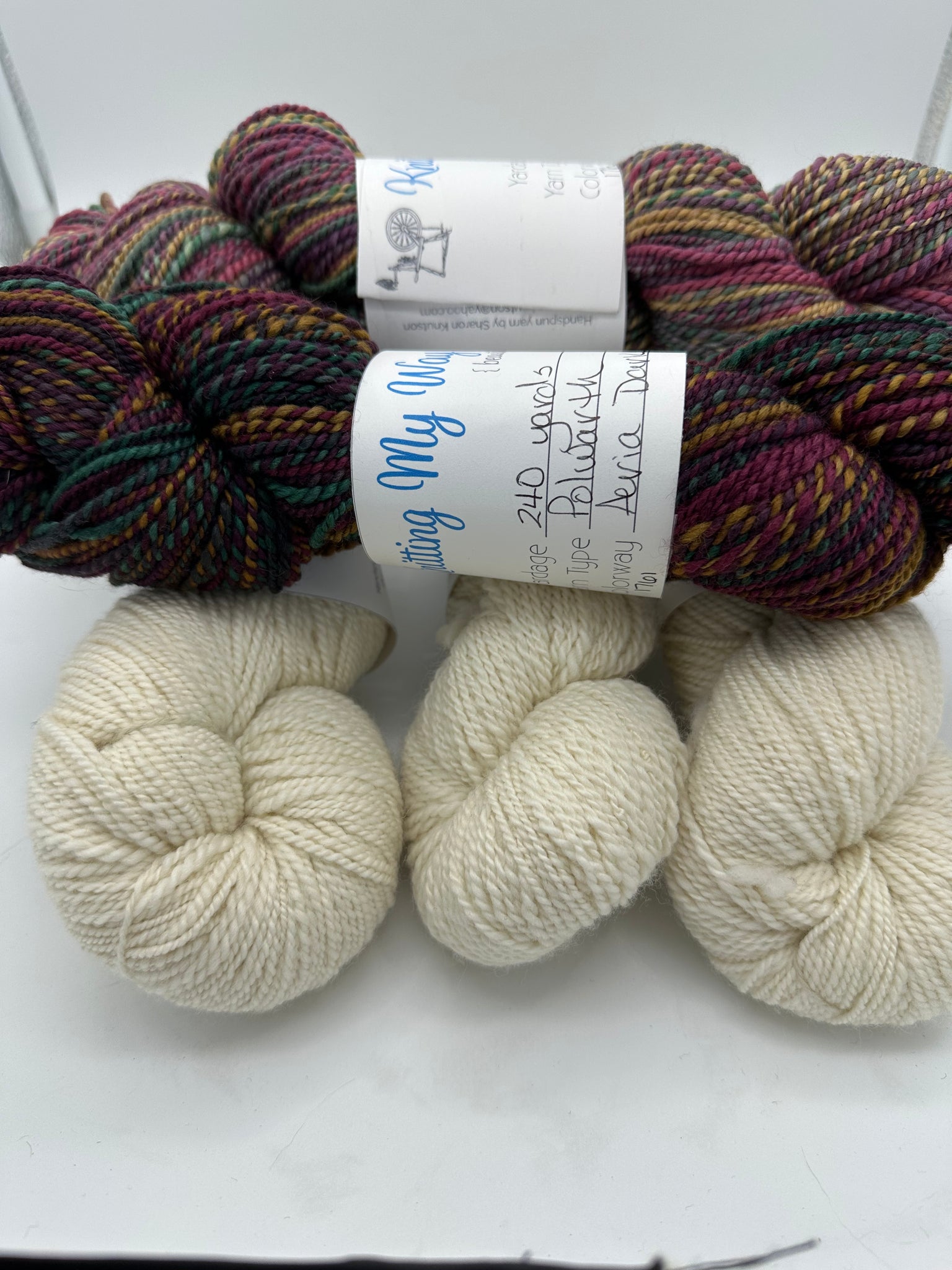 5 skeins of squishy DK weight yarn, total yardage is 1,180 yards of handspun yarn. 3 skeins of white and 2 different shades of variegated colorways in a soft springy Polwarth wool. Aeria is a shawl that is generous sized and one that can be worn in a variety of ways. My picture of the finished shawl uses similar but different yarn for the leaves, this kit has different colored yarn for the leaves, see the pictures of the yarn. The pattern uses German Short Rows which I found to be my favorite way of doing short rows.