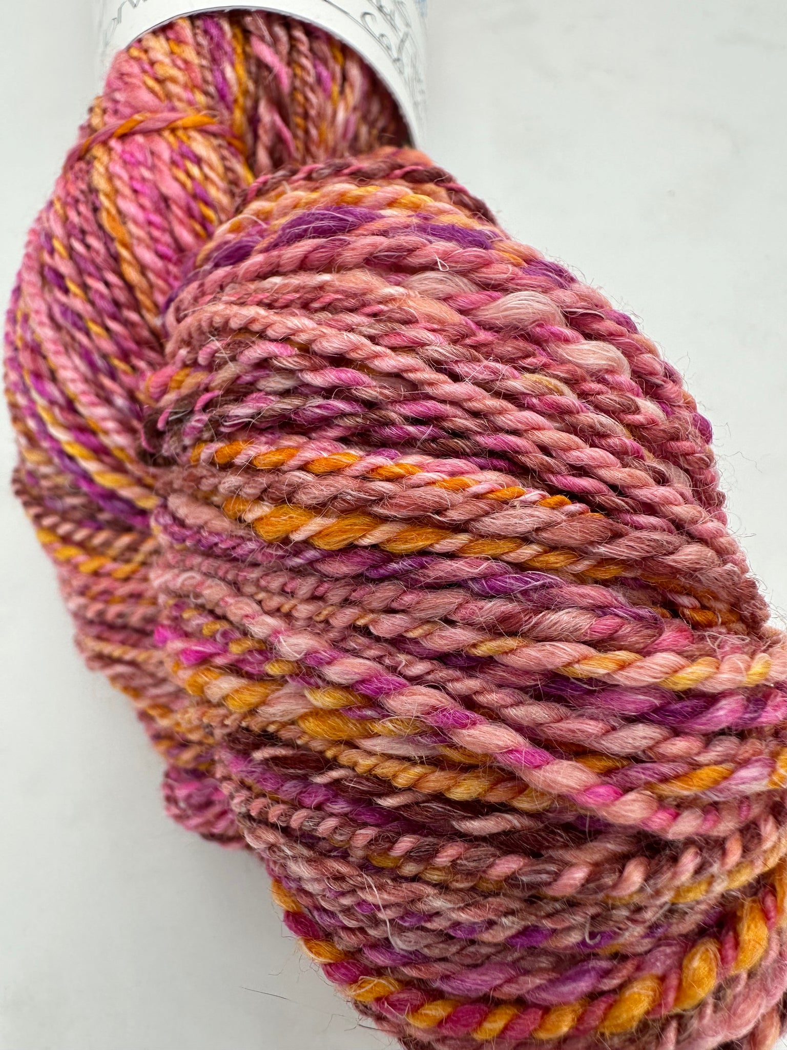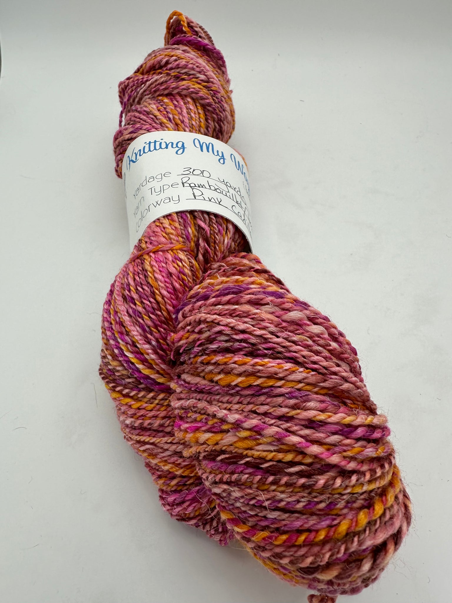 300 yards of DK weight yarn. This is a cool blend of Rambouillet, Tussah Silk and Flax. I love both spinning and working with this fiber base. The flax adds strength and contrast. The silk adds drape and the Rambouillet is a lovely wool. This has all shades of pink and hints of orange.
