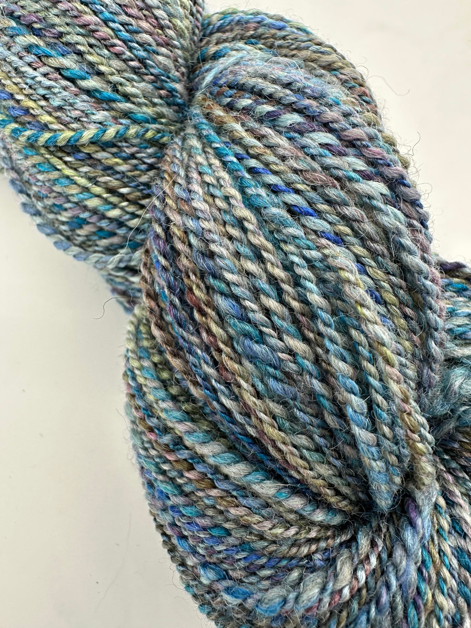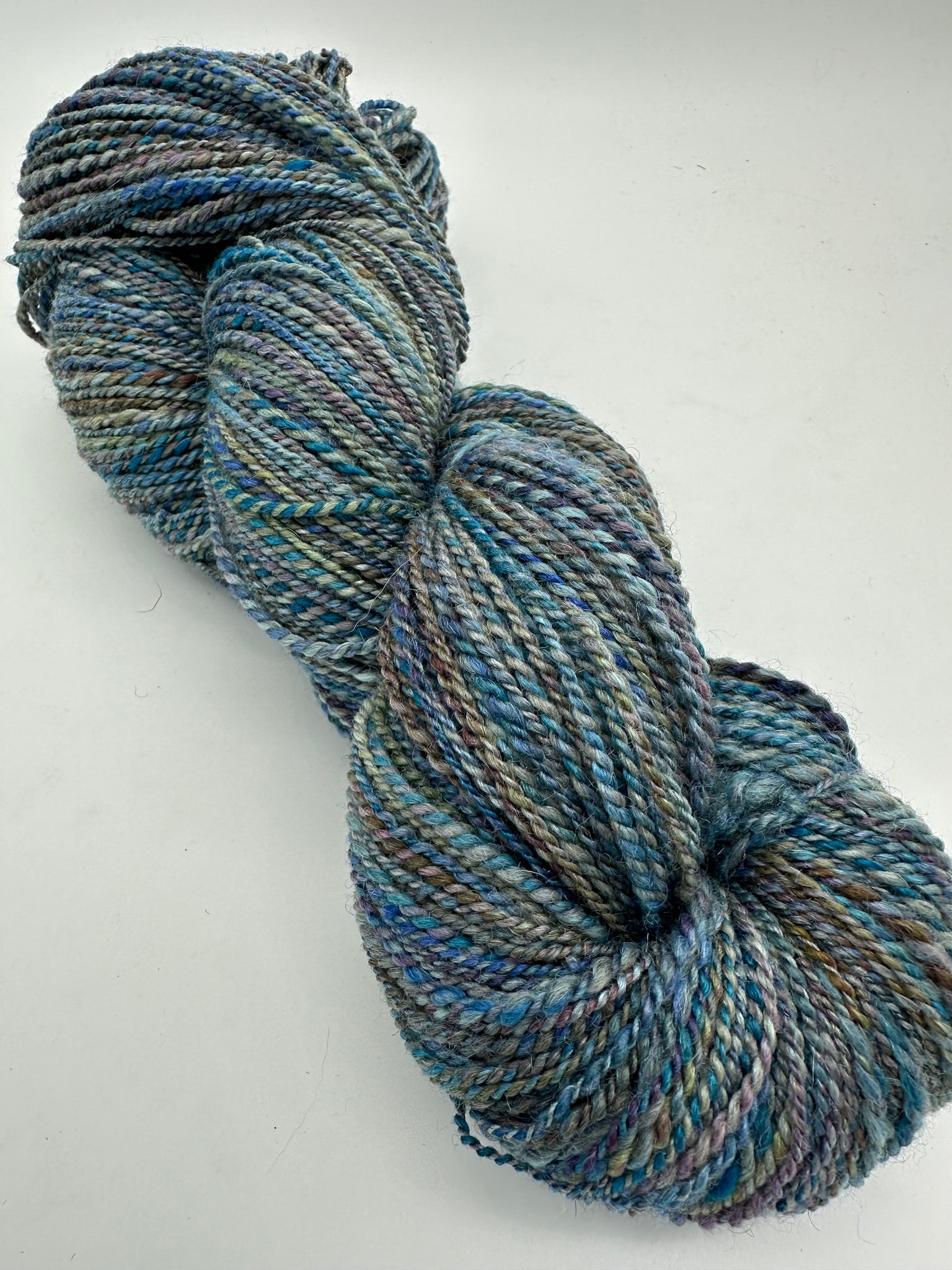 A shimmery set of blues, greens and hints of browns. 350 yards of Sport weight in a 85% mixed BFL (Wool)/ 15% Tussah Silk Blend.